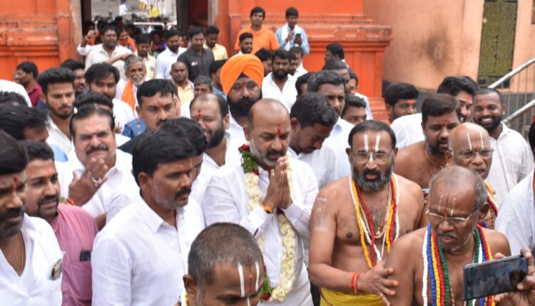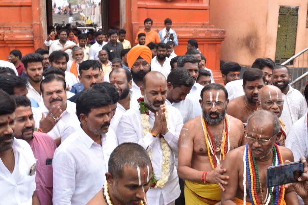 ముద్ర, మల్యాల: మండలంలోని ప్రముఖ పుణ్యక్షేత్రం కొండగట్టు (ముత్యంపేట) శ్రీ ఆంజనేయ స్వామివారిని శనివారం బీజేపీ జాతీయ ప్రధానకార్యదర్శి, కరీంనగర్ ఎంపీ బండి సంజయ్ కుమార్ దర్శించుకున్నారు. ఈ సందర్భంగా స్వామివారికి ప్రత్యేక పూజలు నిర్వహించారు. అనంతరం ఆయన మాట్లాడుతూ కరీంనగర్ మహాశక్తి ఆలయం దర్శనం తర్వాత పవిత్రమైన కొండగట్టు శ్రీ ఆంజనేయ స్వామి ఆశీర్వాదంతో మేడిపల్లి నుంచి ప్రజాహిత యాత్ర ప్రారంభిస్తున్నట్లు తెలిపారు. ఆరు రోజులపాటు వేములవాడ, సిరిసిల్ల నియోజకవర్గాలలో అన్ని మండలాలలో, గ్రామాలలో పూర్తి చేయనున్నట్లు తెలిపారు.