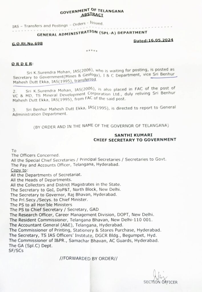 1995 బ్యాచ్ కి చెందిన ఐఏఎస్ అధికారి బెన్హర్ మహేశ్ దత్ ఎక్కా జార్ఖండ్ రాష్ట్ర ఆదివాసీ తెగకు చెందిన వారు. రాష్ట్రంలో గిరిజన సంక్షేమ శాఖ కార్యదర్శిగా పనిచేస్తున్న సమయంలోనే గత ప్రభుత్వం ఆయన్ని బదిలీ చేసి లూప్ లైన్ లో పెట్టింది. మర్రి చెన్నారెడ్డి మానవ వనరుల సంస్థ అదనపు డైరెక్టర్ జనరల్ గా పనిచేశారు. చాలా కాలం తర్వాత మంచి పోస్టింగ్ వచ్చిందనుకున్న తరుణంలో ఐదు నెలలకే అకారణంగా ఆయన్ని బదిలీ చేయడం వివాదాస్పదంగా మారింది. రాష్ట్రంలో ఎన్నికల కోడ్ అమల్లో ఉండగా ఇద్దరు ఐఏఎస్ అధికారులను బదిలీ చేయడం పై ప్రతిపక్షాలు కూడా ఆరా తీస్తున్నాయి.
