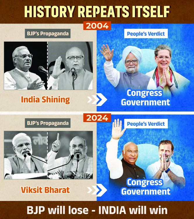 దేశంలో ఇరవై ఏళ్ల కిందటి చరిత్ర పునరావృతమవుతుందని ముఖ్యమంత్రి ఏ రేవంత్ రెడ్డి జోస్యం చెప్పారు. ఈసారి బీజేపీ ఓడిపోతుందని, ఇండియా కూటమి విజయం సాధిస్తుందని ఆయన ధీమా వ్యక్తం చేశారు. 2004లో షైనింగ్ ఇండియా మేనిఫెస్టోతో పోటీకి దిగిన బీజేపీ ఇప్పుడు 2024లో వికసిత్ భారత్ పేరుతో అదే పాత ప్రయోగం చేస్తుందని అన్నారు. అప్పుడు వరుసగా రెండు సార్లు అధికారంలో ఉన్న బీజేపీ పాలనను సోనియా గాంధీ నేతృత్వంలో దేశ ప్రజలు తిరస్కరించారని గుర్తు చేశారు.