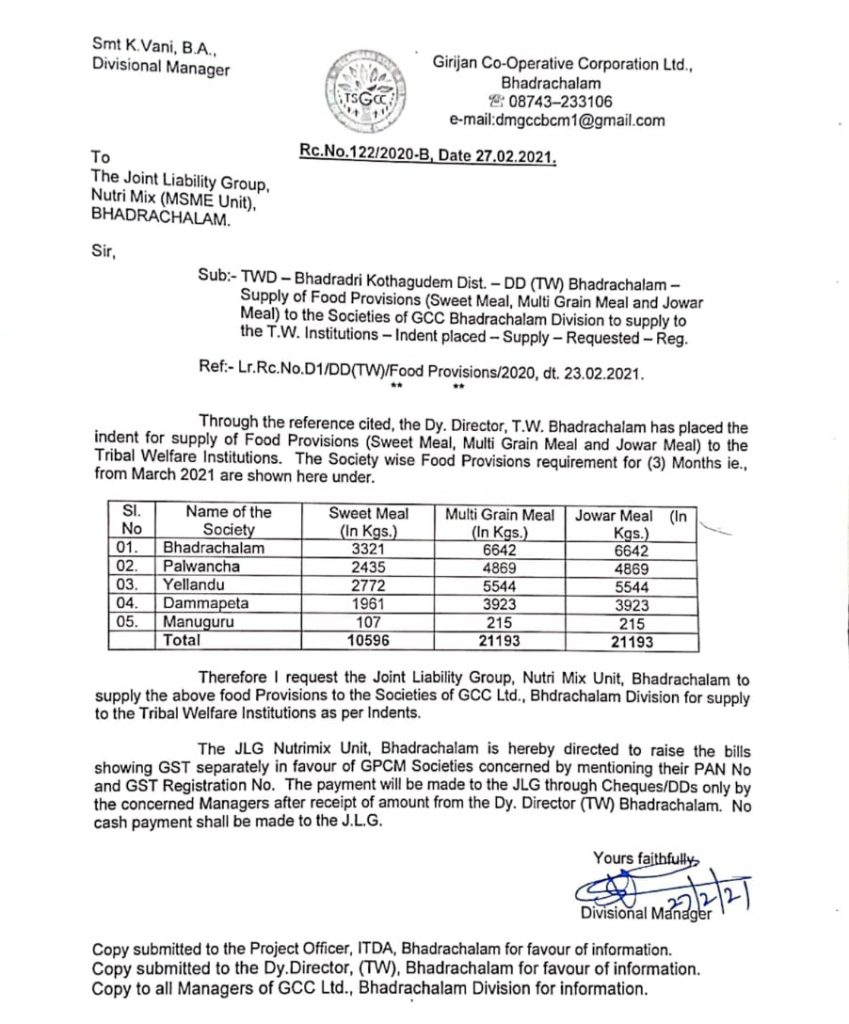 స్వయం కృషి గ్రూపు ద్వారా ములుగు జిల్లా లోని సంక్షేమ హాస్టళ్ళకు మిల్లెట్స్ ఆహారం సరఫరా చేయాలని జిల్లా కలెక్టర్ ఆదేశించారని మూడు నెలల క్రితం ఐటీడీఏ అధికారులు చెప్పారు. మూడు నెలల నుంచి గ్రూపు సభ్యులు ఐటీడీఏ చుట్టూ తిరుగుతున్నాసంబంధిత ఫైల్ పై కలెక్టర్ సంతకం పెట్టలేదంటూ అధికారులు చెప్తూ వచ్చారు. అటు అంగన్ వాడీకి ఆహార సరఫరా ఆగిపోయే సూచనలు ఉండటం, హాస్టళ్ళకు సరఫరా చేసే ఉత్తర్వులు రాక పోవడంతో యూనిట్ ను మూసి వేసే ప్రమాదం ఉందని ఆదివాసీ మహిళలు వాపోతున్నారు. ఇదే సమయంలో భద్రాచలంలోని స్వయం కృషి గ్రూపుకు హాస్టళ్ళకు ఆహారం సరఫరా చేసే ఆర్డర్ వచ్చేసింది.