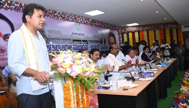 జయశంకర్ భూపాలపల్లి జిల్లాకేంద్రంలో సోమవారం రాష్ట్ర ఐటీ, పురపాలకశాఖ మంత్రి కల్వకుంట్ల తారక రామారావు సుడిగాలి పర్యటన చేశారు. మంత్రి కేటీఆర్ ఉదయం హైదరాబాద్ నుంచి హెలికాప్టర్ ద్వారా భూపాలపల్లికి చేరుకున్న మంత్రి కేటీఆర్ జిల్లాకేంద్రంలో 15 ఎకరాల స్థలంలో రూ.59 కోట్ల45 లక్షల వ్యయంతో నిర్మించిన సమీకృత జిల్లా కలెక్టర్ కార్యాలయాన్ని, ఆధునిక సాంకేతిక పరిజ్ఞానoతో రూ. 25.90 కోట్ల వ్యయంతో, 37 ఏకరాల స్థలంలో నిర్మించిన జిల్లా పోలీసు కార్యాలయాన్ని, డబుల్ బెడ్ రూం ఇండ్లను, పోరాట యోధుడు సర్దార్ సర్వాయి పాపన్న గౌడ్ విగ్రహాన్ని ప్రారంభించారు. కలెక్టరేట్ లో ఏర్పాటు చేసిన సమావేశంలో మంత్రి కేటీఆర్ మాట్లాడుతూ ప్రొఫెసర్ జయశంకర్ సార్ పేరు పెట్టిన ఈ జిల్లాలో కలెక్టర్ కార్యాలయంను ప్రారంభించడం అదృష్టంగా భావిస్తున్నానని అన్నారు.
