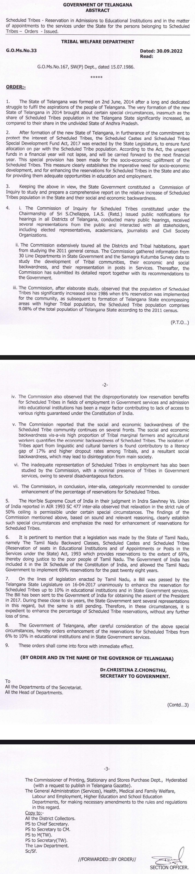 విద్య, ఉద్యోగాల్లో 50 శాతం రిజర్వేషన్లు మించ కూడదంటూ జీవో నంబర్ 3 ని కొట్టివేసిన సందర్భంగా సుప్రీం కోర్టు అభిప్రాయపడింది. ఈ నేపథ్యంలో తెలంగాణ ప్రభుత్వం జారీ చేసిన జీవో 33 చట్టబద్దత ప్రశార్థకంగా మారింది. గిరిజన రిజర్వేషన్లను 6 నుంచి10 శాతానికి పెంచే ముందు తెలంగాణ ప్రభుత్వం చెల్లప్ప కమిషన్ నియమించింది. జనాభా ప్రాతిపదికన గిరిజన రిజర్వేషన్లను పెంచడంతో పాటూ వాల్మీకి బోయ, తైత లంబాడీలను ఎస్టీ జాబితాలో చేర్చడం కోసం నియమించిన ఈ కమిషన్ నివేదికను ఆమోదించిన ప్రభుత్వం తెలంగాణలో గిరిజన రిజర్వేషన్లను 2011 జనాభా లెక్కల ప్రకారం 10 శాతానికి పెంచుతూ 16.4.2017 న రాష్ట్ర అసెంబ్లీ ఒక ప్రత్యేక తీర్మానం చేసింది. ఈ తీర్మానాన్నికేంద్రానికి పంపినా అటువైపు నుంచి ఎటువంటి స్పందనా రాక పోవడంతో ఐదేండ్ల తర్వాత రాష్ట్ర ప్రభుత్వమే రిజర్వేషన్లు పెంచుతూ ఇటీవల జీవో జారీ చేసింది. కొన్ని ప్రత్యేక పరిస్థితుల్లో స్థానికి అవసరాలను దృష్టిలో పెట్టుకుని ప్రత్యేక రిజర్వేషన్లను కల్పించవచ్చని రాష్ర్ట ప్రభుత్వం భావిస్తున్నది. తమిళనాడులో రిజర్వేషన్లు 67 శాతంగా పెంచడాన్ని ఉదాహరణగా పేర్కొంటున్నారు. అయితే తమిళనాడు రిజర్వేషన్లకు సంబంధించి పార్లమెంటులో రాజ్యాంగ సవరణ చేయగా తెలంగాణ రిజర్వేషన్ల అంశానికి కేంద్రం మద్దతు లేక పోవడం విశేషం. ఈ కారణాలతో 10 శాతం రిజర్వేషన్ల జీవో చట్టపరంగా నిలబడుతుందా లేదా అనేది చర్చనీయాంశమైంది. మునుగోడు ఉప ఎన్నికలను దృష్టిల లో పెట్టుకుని కేసీఆర్ హడావుడిగా ఈ నిర్ణయం తీసుకున్నారనే అభిప్రాయం కూడా వ్యక్తమవుతున్నది.