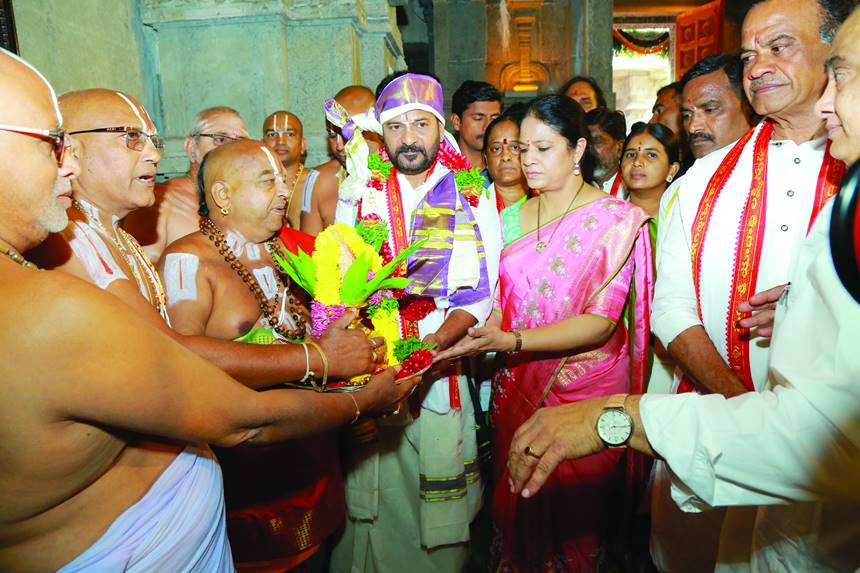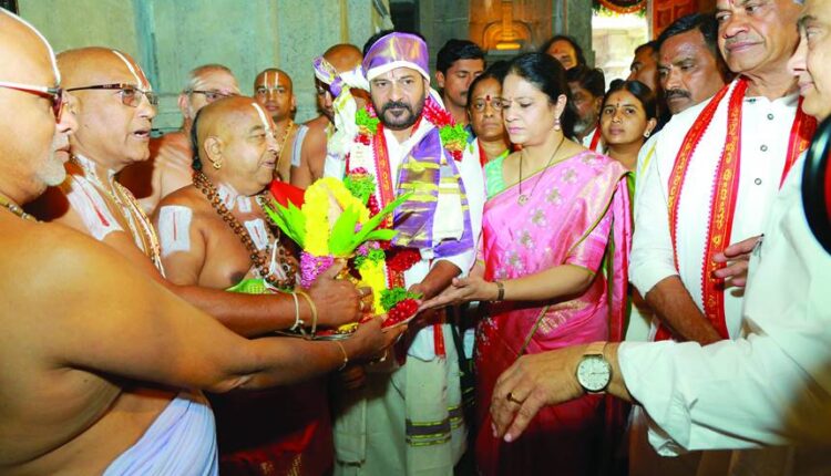 యాదగిరి స్వామికి పట్టువస్త్రాలు సమర్పించిన సిఎం రేవంత్ దంపతులు