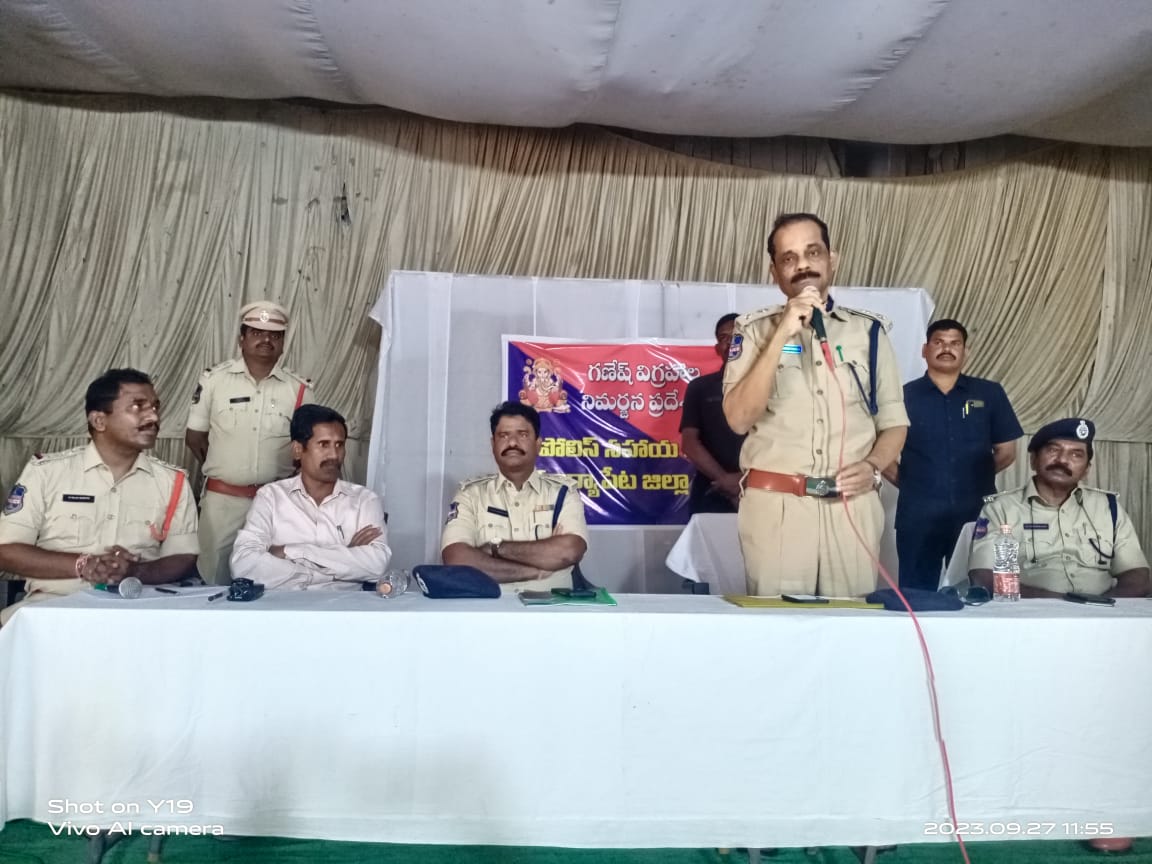 జిల్లా కేంద్రంలో గణేష్ నిమజ్జనం కార్యక్రమానికి సంబంధించి పోలీసు సిబ్బందికి ఎస్పీ విధుల నిర్వహణపై సలహాలు సూచనలను అందజేసినారు. ఉత్సవాల నిర్వహణకు సిబ్బంది రక్షణ కల్పిస్తూ రెగ్యులేట్ మాత్రమే చేయాలని, ఉత్సవంలో భాగస్వామ్యమై ఎదురు నిర్వహించాలని సూచించారు. ఉత్సవ కమిటీలకు ఉత్సవంలో పాల్గొనే వారికి ఆటంకం కలగకుండా చూడడం మన ముఖ్య విధి అని తెలిపారు.ఈ కార్యక్రమంలో ఎస్పీ వెంట అదనపు ఎస్పీ నాగేశ్వరరావు డివిజన్ డిఎస్పి నాగభూషణం పట్టణ సిఐ రాజశేఖర్, CI లు, SI లు, బందోబస్తు నిర్వహణ సిబ్బంది ఉన్నారు.