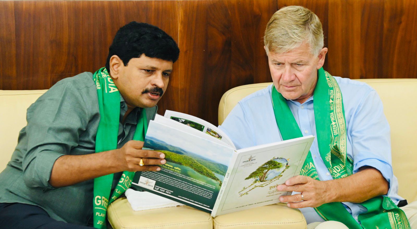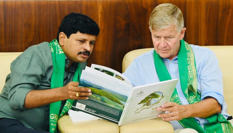 శుక్రవారం నాడు బేగంపేటలో “గ్రీన్ ఇండియా ఛాలెంజ్” సృష్టికర్త, రాజ్యసభ సభ్యులు జోగినిపల్లి సంతోష్ కుమార్ తో కలిసి మొక్కలు నాటిన ఎరిక్ సోల్హీమ్.. అనంతరం మాట్లాడుతూ.. “మనిషి సృష్టించిన కాలుష్యం, కర్భన ఉద్గారాలు, అడవులను నరకడం” ఈ భూమిని అతలాకుతలం చేస్తున్నాయన్నారు. కానీ తెలంగాణ రాష్ట్రంలో హరితహారం కార్యక్రమం ద్వారా దశాబ్ధ కాలంలోనే 7% శాతం అడవులు పెరగడం అద్భుతమైన విషయం. ఇది ముఖ్యమంత్రి కేసీఆర్ గారి విజనరీ లీడర్ షిప్ కు నిదర్శనం. ఇలాగే దేశంలో ప్రతీ రాష్ట్రం తెలంగాణ స్పూర్తిగా.. మొక్కలు నాటే కార్యక్రమాలు చేపట్టాలి.